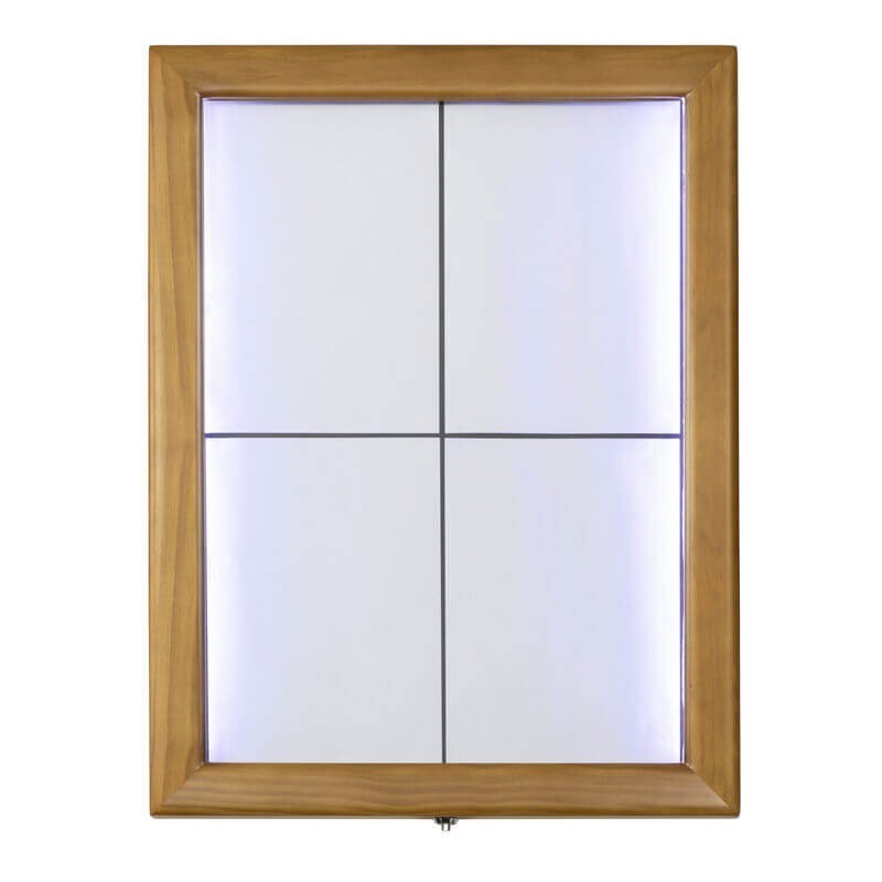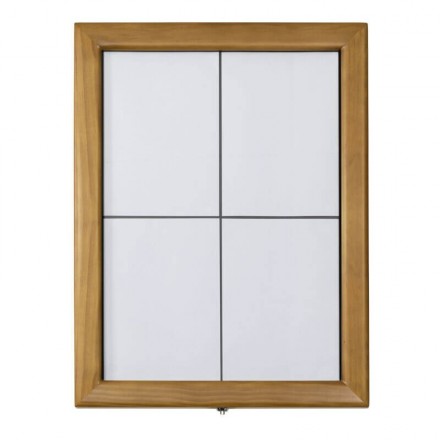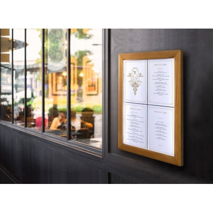 The CLASSIC illuminated menu holder is designed with a 5* teak-colored hardwood frame with key lock and very resistant anti-vandal security window , ideal for wall mounting indoors or outdoors if sheltered and protected from bad weather.