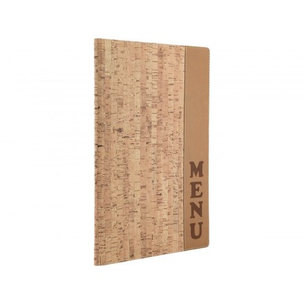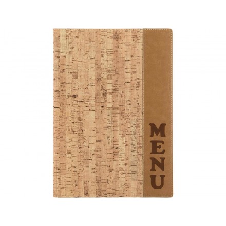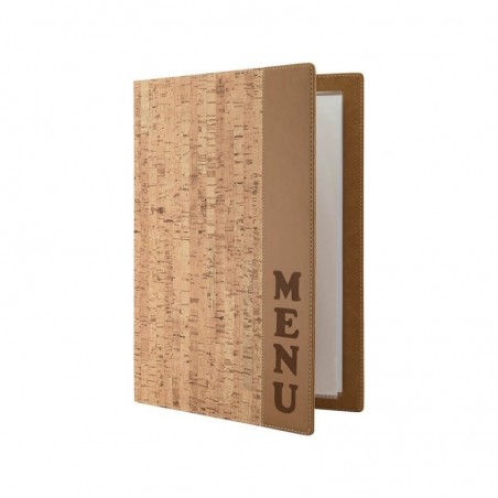 23.64 € TTCProtège-menu restaurant avec couverture en polyuréthane imitation liège, inscription MENU, un double insert à l'intérieur pour 2 feuilles format A4 maintenu par un élastique, bords cousus.