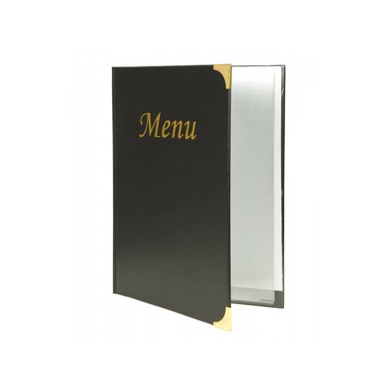 8.66 € TTCProtège-menu noir en PVC avec inscription MENU en lettres dorées sur la couverture, coins de protection en métal, doté à l'intérieur de 4 inserts transparents recto/verso + 1 insert transparent collé sur chaque couverture (10 vues), pour des feuilles format A5, nettoyage facile