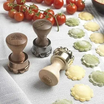 57.90 € TTCMoule à ravioli MARCATO à coupe circulaire en forme de fleur, diamètre 50mm, corps en laiton, disque central en aluminium anodisé, manche en bois massif, disponible en coloris Or et Champagne
