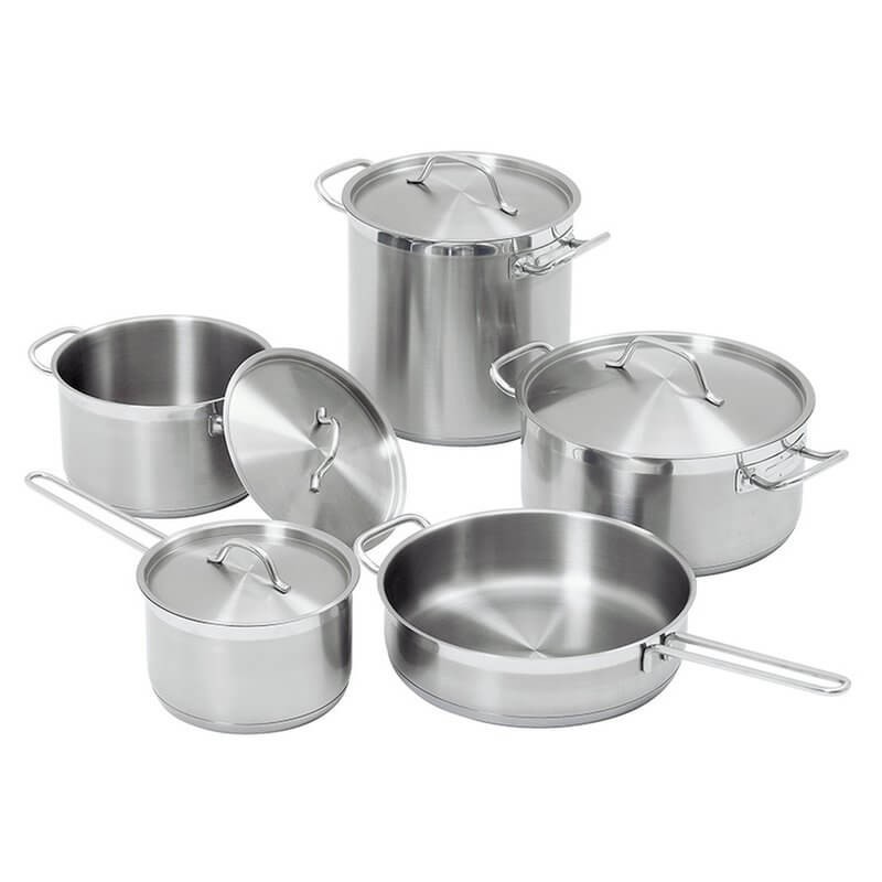 143.39 € TTCSet of 5 professional stainless steel stockpots including 4 stockpots with lid + 1 frying pan, with cold handles, induction compatible, pouring edge
