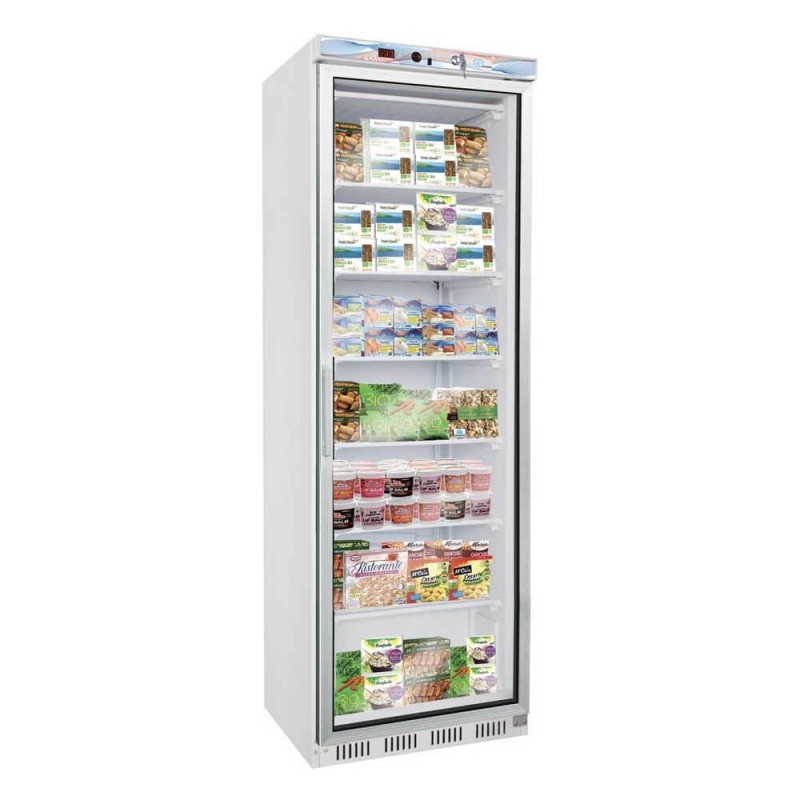 2,042.42 € TTCVitrine réfrigérée négative 400L triple vitrage, carrosserie acier anti-corrosion laquée blanc, intérieur ABS thermo-moulé avec éclairage LED, réfrigération par air statique avec thermostat réglable de -18°C à -22°C, inclus 6 clayettes fixes 480x440mm