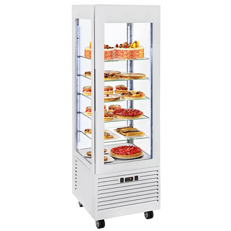 3,201.44 € TTCPanoramic display case ROLLER GRILL 360L equipped with 5 glass shelves 445x455mm on 6 display levels (10kg load per level), white powder-coated steel exterior, 4 glazed sides with double glazing, temperature +2°C +10°C to ventilated cold, vertical LED lighting at 4 corners, door with magnetic closure, 4 wheels with double pads, ideal for all your pies, pastries and desserts made with fresh fruit