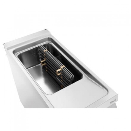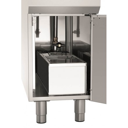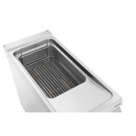 L'huile sera chauffée grâce aux résistances blindées immergées dans la cuve. Une zone froide est également présente au fond de la cuve afin de recueillir les résidus de friture, pour de ne pas détériorer la qualité de l'huile. Le robinet de vidange se trouve sous la cuve de la friteuse électrique pro, pour un vidage facile.