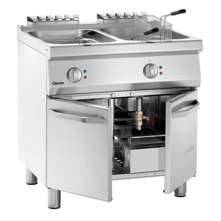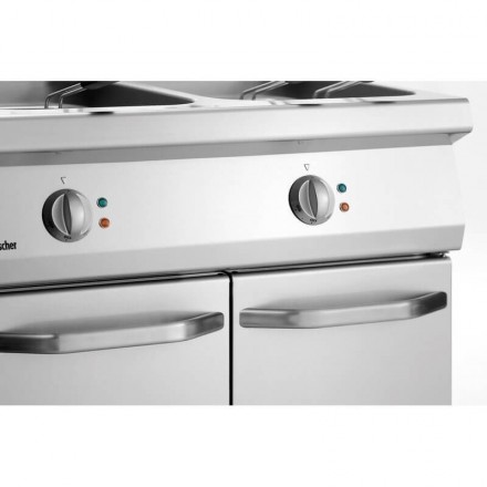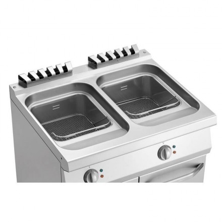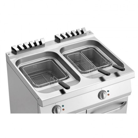 La friteuse sur coffre possède des pieds à hauteur réglable et est conçue avec 2 grandes cuves de 23 litres, dans lesquelles se trouvent 1 panier de 7 litres, et 2 paniers de 4 litres.