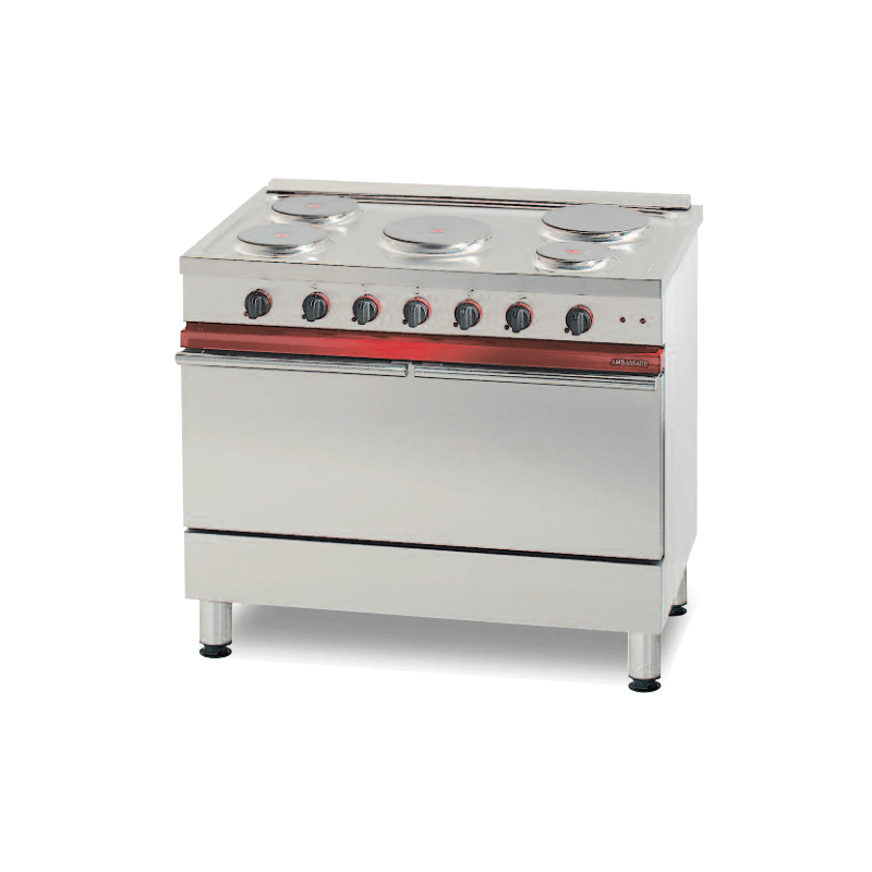 3,590.70 € TTCFourneau professionnel Ambassade en inox composé d'une table de 1000x650mm avec 5 brûleurs gaz avec grilles en fonte (2x3kW + 1x4kW + 1x1.5kW + 1 brûleur central de 5kW), avec thermocouple de sécurité, 1 four gaz 137L de 3.5kW à flamme autostabilisée livré avec 1 grille + 1 plaque, pieds inox avec vérins réglables