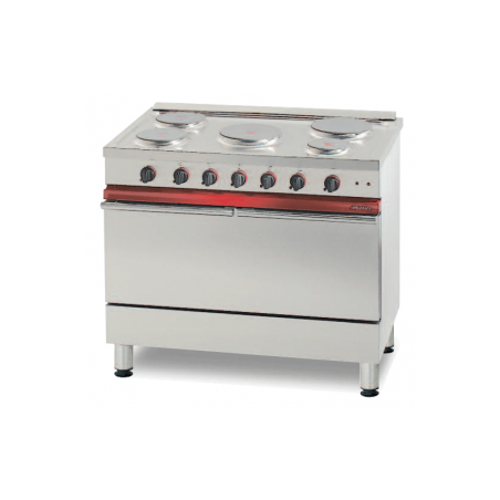 Très apprécié par les traiteurs pour le maintien en température de grands plats de service, le fourneau CG 1051 B possède 5 feux vifs à gaz, dont 2 brûleurs de 3kW, 1 brûleur de 4kW et 1 brûleur de 1.5kW, et un brûleur central de 5kW soit une puissance totale de 16.5kW, ainsi qu'un grand four gaz de 137L d'une dimension intérieure de L900xP455xH305mm qui permettront de cuire toutes vos préparations, 1 grille et 1 plaque inclues.