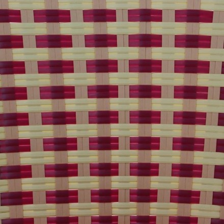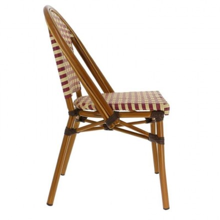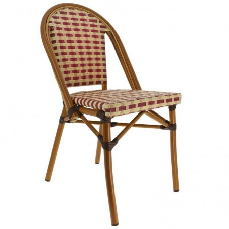 113.68 € TTCChaise de restaurant empilable avec structure en aluminium finition époxy teinte teck, assise et dossier en polypropylène tressé beige et bordeaux, utilisation extérieur et/ou intérieur, résiste aux UV et à la pluie, hauteur assise 46cm
