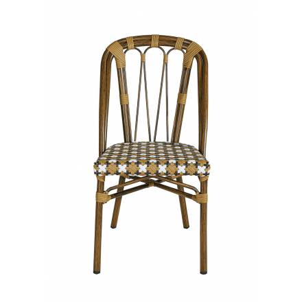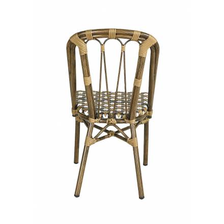 130.79 € TTCRestaurant chair with epoxy-coated aluminum frame (bamboo look), woven polyethylene seat and backrest, stackable, UV and weather resistant, ideal for outdoor use, seat height 45cm, tube thickness 1.5mm, tube diameter 28mm