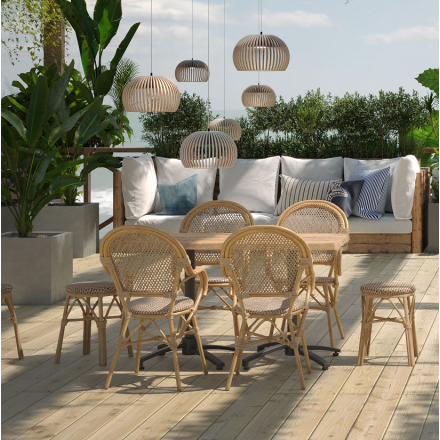 In a natural style, the stool is designed with an aluminum structure in ø28mm, 1.5mm thick tubes, very robust, with "bamboo caramel look" epoxy paint finish, covered with woven rattan. It goes perfectly with the ORLÉANS chairs and the < a href="https://chr-market-france.fr/fr/salle/4019-armchair-ROCHELLE.html">armchairs ROCHELLE.