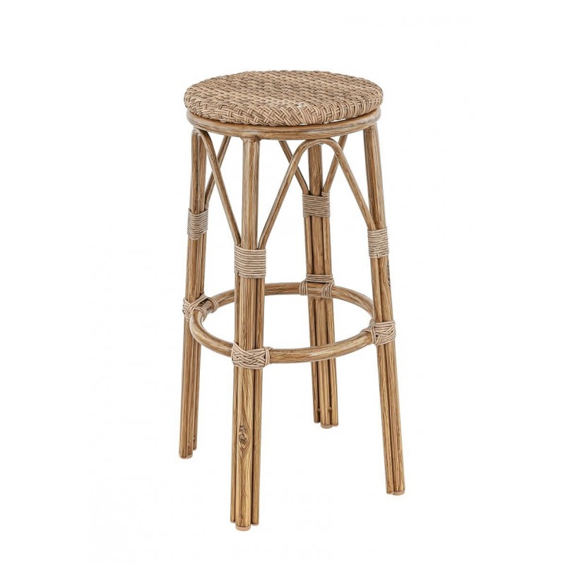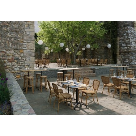 In a natural style, the stool is designed with an aluminum structure in ø28mm, 1.5mm thick tubes, very robust, with "bamboo caramel look" epoxy paint finish, covered with woven rattan. It goes perfectly with the ORLÉANS chairs and the armchairs ROCHELLE.