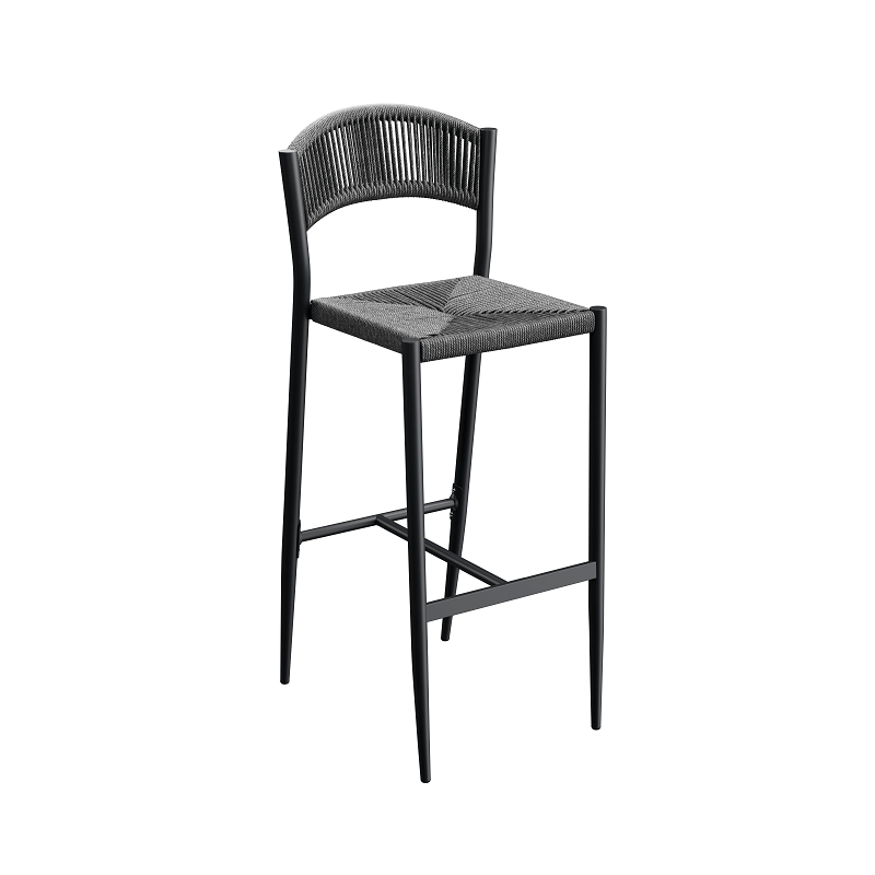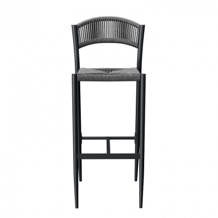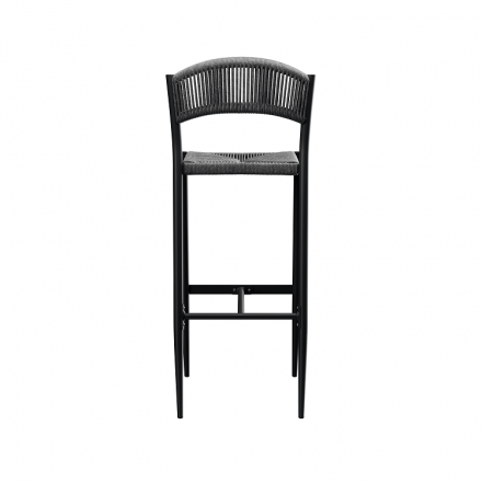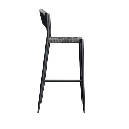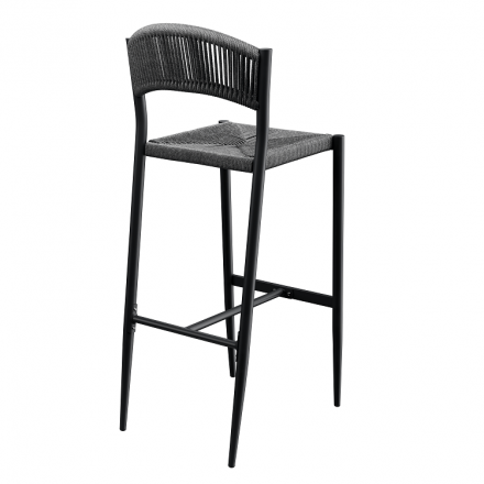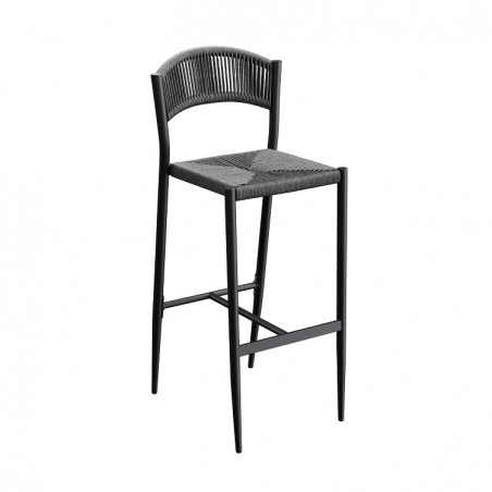 189.75 € TTCOutdoor high chair for restaurant terrace, steel structure with anthracite epoxy finish, seat and backrest woven in 5mm twisted PE rope imitation anthracite tint, UV and weather resistant, seat height 76cm