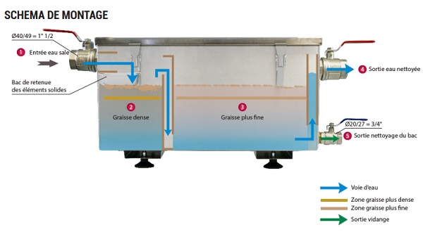 The grease trap is designed to be installed under a sink in the kitchen and must be connected to the main drain or directly to the siphon. All equipment producing grease, such as ovens or fryers, can also be connected (dishwashers are not recommended). It should be easily accessible to facilitate emptying and cleaning operations.