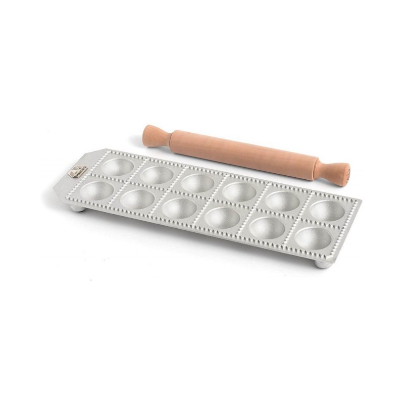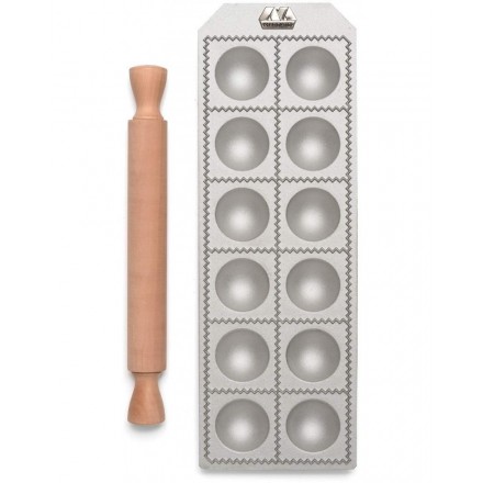 42.90 € TTCTablette à ravioli en aluminium MARCATO, 12 empreintes rondes de ø5.5cm, permet de réaliser 12 gros ravioli ronds à farcir à la fois, livrée avec son rouleau en bois massif