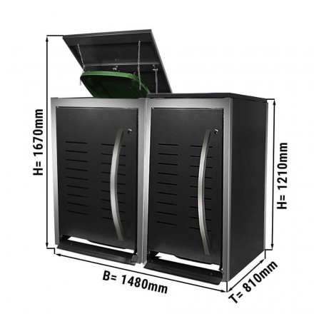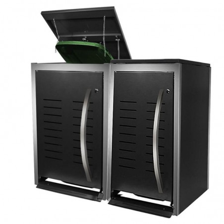2,248.22 € TTCConteneur à poubelle extérieur avec commande à pédale pour ouverture du couvercle, en acier de qualité supérieur noir, porte avec fermeture douce, permet de stocker une poubelle hors de vue pour plus d'esthétisme aux abords de votre établissement, capacité 2 poubelles (non incluses)