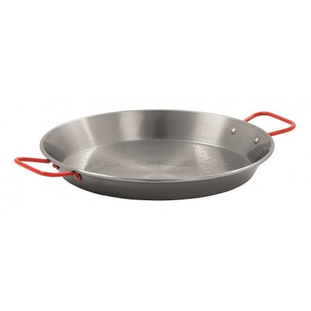 23.23 € TTCPaella pan made of polished steel ø420mm, bottom diameter ø370mm, heat-resistant handles lacquered in red - the paella pan is also very suitable for the preparation of hash browns, minced meat, pan-fried gyros or chili con carne... - (burner and tripod not included)