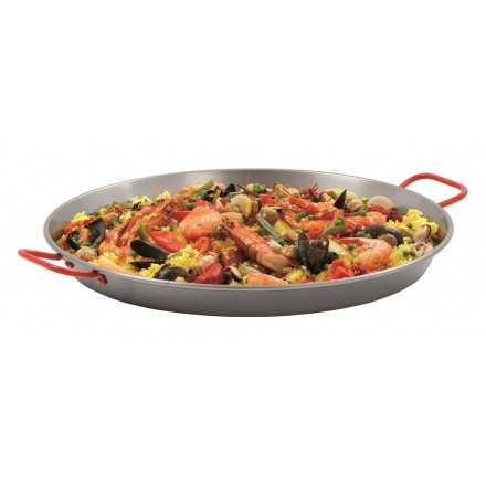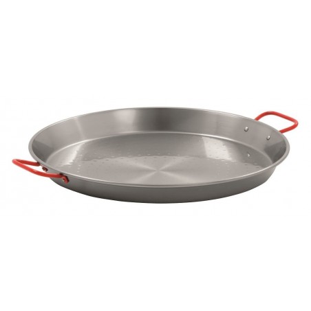42.43 € TTCPaella pan made of polished steel ø600mm, bottom diameter ø535mm, heat-resistant handles lacquered in red - the paella pan is also very suitable for the preparation of hash browns, minced meat, pan-fried gyros or chili con carne... - (burner and tripod not included)