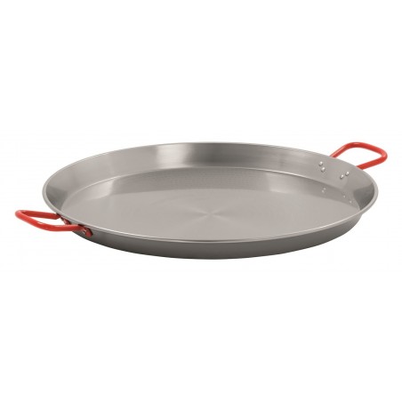 47.75 € TTCPaella pan made of polished steel ø650mm, bottom diameter ø585mm, heat-resistant handles lacquered in red - the paella pan is also very suitable for the preparation of hash browns, minced meat, pan-fried gyros or chili con carne... - (burner and tripod not included)