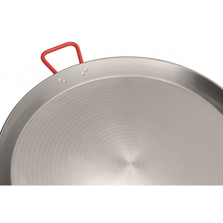 Paella pan made of polished steel ø650mm, bottom diameter ø585mm, heat-resistant handles lacquered in red - the paella pan is also very suitable for the preparation of hash browns, minced meat, pan-fried gyros or chili con carne...