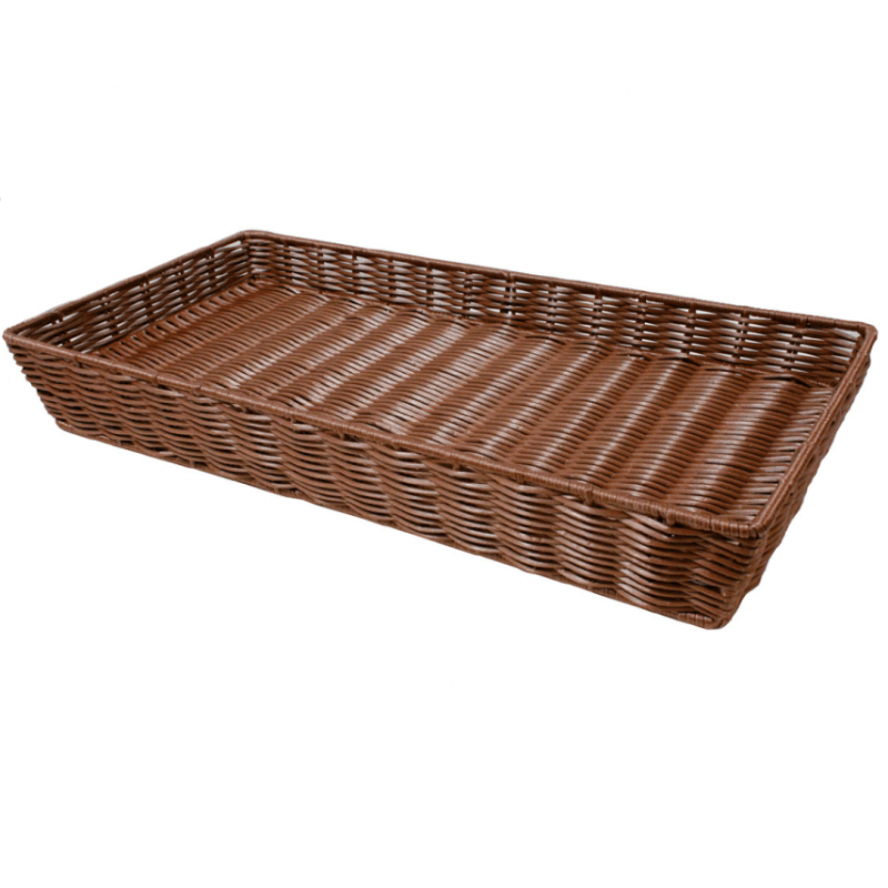 110.29 € TTCSet of 8 theatrical baskets in brown wicker-effect polypropylene braiding, epoxy-painted metal frame - SGS food contact certification - Dimensions 50x25x7.5cm - Model raised by 4.5cm at the bottom for a mass effect