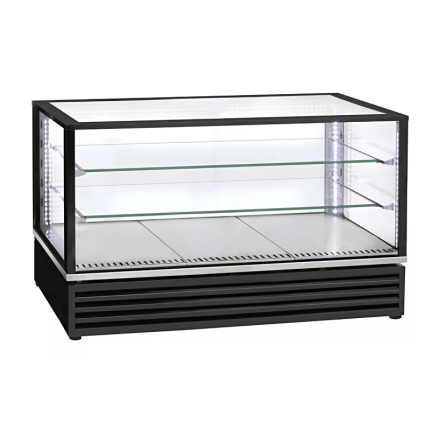 3,300.81 € TTCBlack lacquered refrigerated panoramic display case, 3 display levels with a capacity of 3xGN1/1 per level, 2 glass shelves 1045 x 490mm, vertical LED lighting in 4 corners, ventilated refrigeration, uniform temperature +2°C to +10°C, defrost automatic, electronic thermostatic regulation, rear sliding door on service side, 4 double-glazed glass sides, magnetic closing door