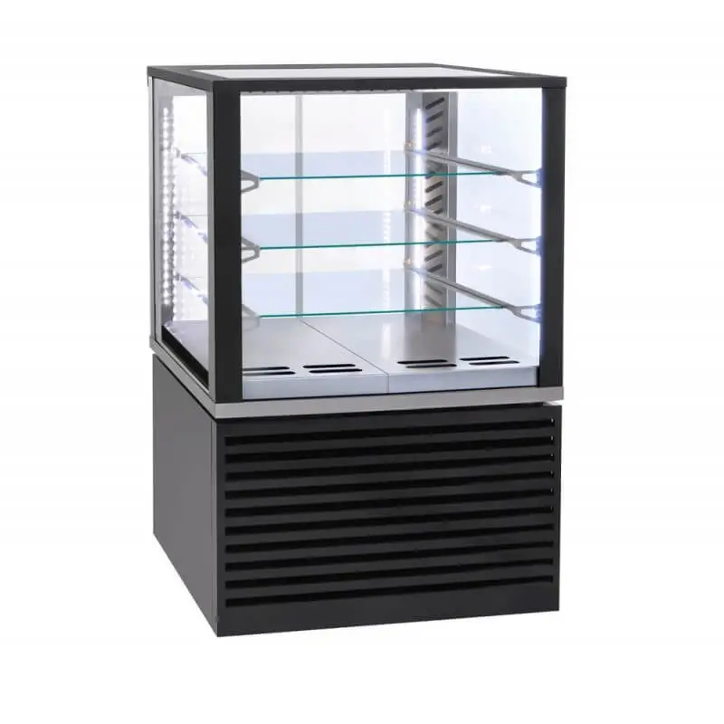 3,023.26 € TTCBlack lacquered heated panoramic display case, 4 exhibition levels with a capacity of 2xGN1/1 per level, 3 glass shelves 565 x 540mm, removable stainless steel lower shelves, vertical LED lighting at 4 angles, temperature +30°C to + 85°C, electronic thermostatic regulation, rear sliding door on service side, 4 double-glazed glass sides, magnetic closing door, humidity control, delivered without GN container