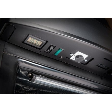 With a capacity of 300L, finished in black and with external square aluminum handle, this product is equipped with an interior vertical LED light, a lock, a digital thermometer display, 5 fixed shelves , a self-closing door and double-layer tempered safety glass.