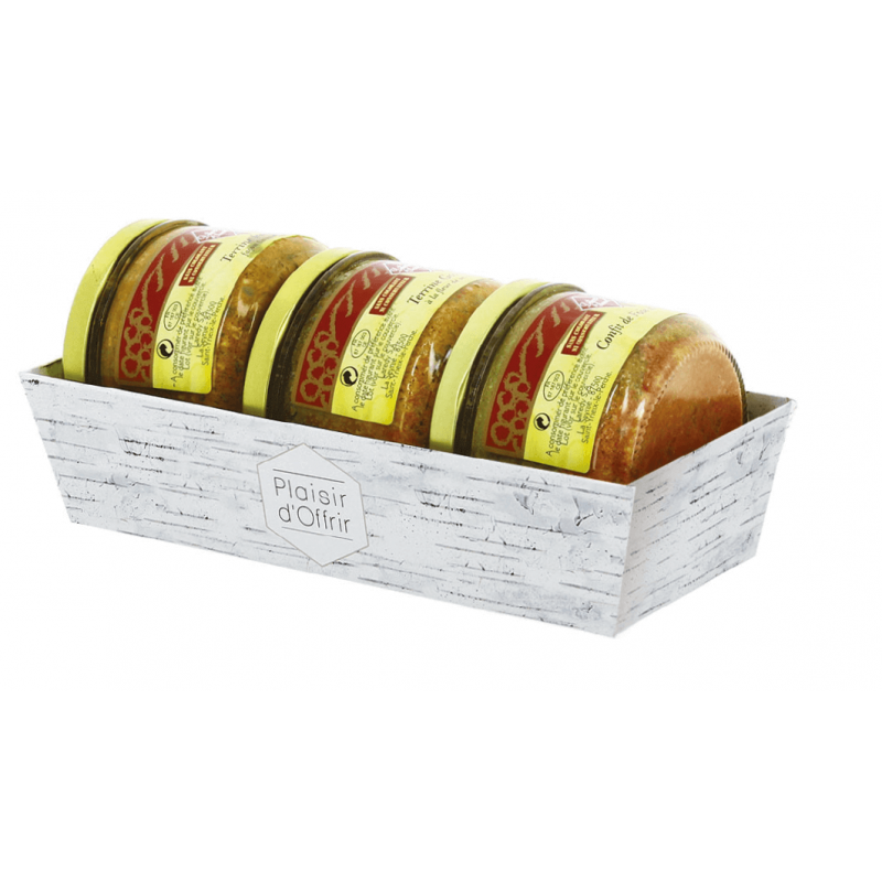 130.57 € TTCBanetou rectangle in birch decor cardboard, four-color printing with glossy finish, certified food contact with a design that is both simple and modern, can be used in the preparation of gourmet packages and regional products - ideal for packaging 3 verrines of 180 grams