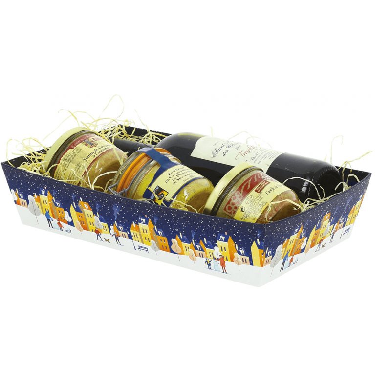 64.18 € TTCMedium rectangular Christmas basket in cardboard, four-color printing with matte finish, midnight blue interior, midnight blue exterior, snowy village decor