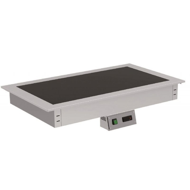 2,911.95 € TTCBuilt-in ceramic hob for GN containers, capacity 5xGN1/1, made of AISI304 18/10 stainless steel, satin finish, 6mm thick SCHOTT CERAN ceramic glass, adjustable temperature from +50°C to +100°C, heating by silicone resistance with thermal safety fuse, removable control panel (1m long) with digital thermostat and light switch (removable switch) - Dimensions L1745xP625xH120mm / 2750W