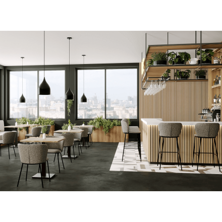 The SANDRA barstool will furnish your restaurant room with charm and elegance, in particular thanks to its seat and back covered in a water-repellent recycled fabric that is ultra easy to clean, and filled with foam for excellent comfort.