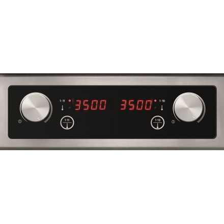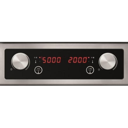 The hob has 2 cooking zones ø235mm with adjustable temperature from 60°C to 240°C on 10 levels (20°C intervals). The 7000W power can be distributed freely between the two cooking zones. For quick cooking or to strongly color food, the left cooking zone can reach 5000W.