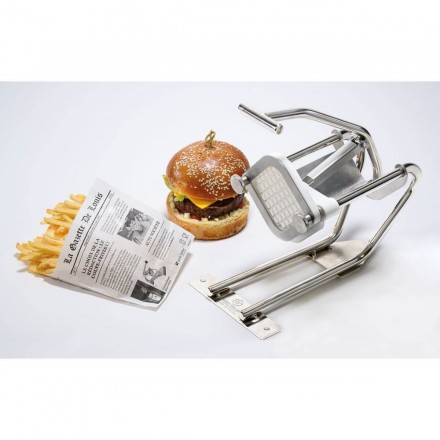 Fabriqué en France, cet appareil à couper les frites de la marque Louis Tellier est doté d'un poussoir et d'un couteau pour couper des frites interchangeables sans outils. C'est un modèle robuste et très solide, fabriqué en acier inoxydable avec glissière PA et socle antidérapant en inox, à poser sur une table.