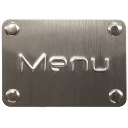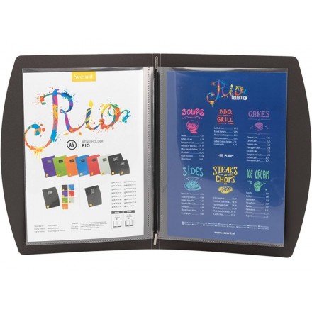 The RIO menu holder in A5 format has a flexible plastic cover that is resistant to water, stains, scratches, and has a stainless steel plate with "Menu" inscription, and is very easy to clean .