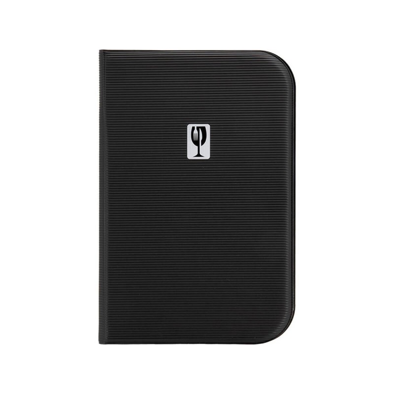 12.51 € TTCProtège-menu noir en PVC avec inscription MENU en lettres dorées sur la couverture, coins de protection en métal, doté à l'intérieur de 4 inserts transparents + 1 insert transparent collé sur chaque couverture (10 vues), pour des feuilles format A4, nettoyage facile