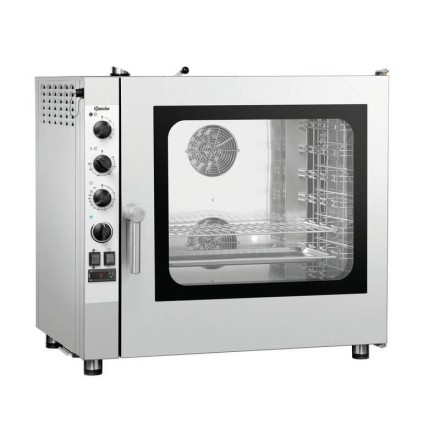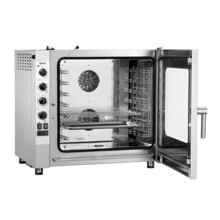 Four mixte à vapeur en inox CNS 18/10 équipé de 7 glissières amovibles au format GN1/1 ou 600x400mm, commandes mécaniques latérales, plage de température de 50°C à 280°C, minuterie de 0 à 120 minutes, 1 programme de cuisson, 2 moteurs réglable sur 2 niveaux de vitesse, production de vapeur par injection directe, chambre de cuisson arrondie avec éclairage, porte à double vitrage, raccord pour sonde de température à cœur, inclus 1 grille GN1/1, 1 plaque GN1/1, 1 tuyau d'arrivée