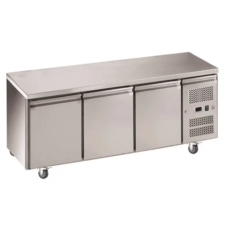 2,004.21 € TTCTable négative centrale sur roulettes avec enceinte réfrigérée de 417L fermée par 3 portes avec système de fermeture automatique, construction intérieur et extérieur inox, réfrigération ventilée -18°C/-22°C à 38°C, groupe logé extractible sur glissières, dégivrage automatique, évaporateur traité anticorrosion, isolation 50mm, thermostat électronique DIXELL, 1 niveau de glissière et 1 grille GN1/1 par porte