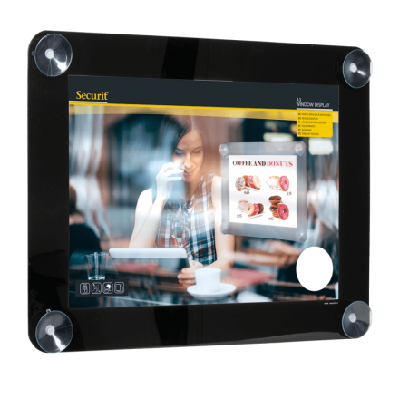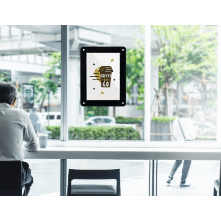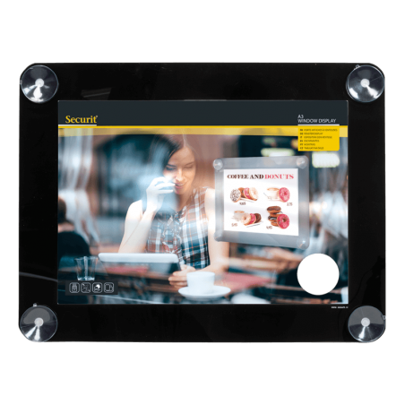 39.90 € TTCPorte affiche pour vitrine, pour une feuille format A3, maintien par ventouses, résistant aux UV