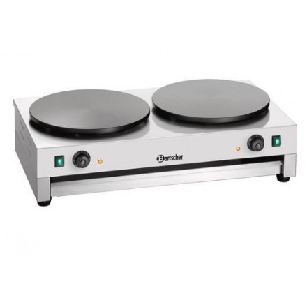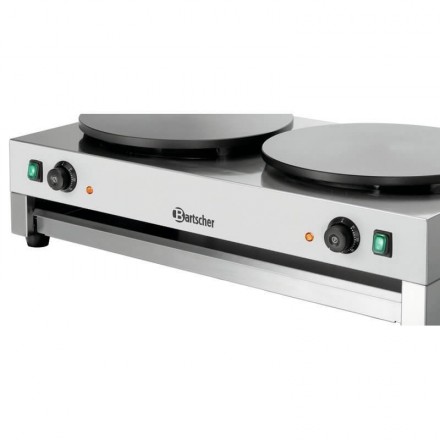 Cette crêpière électrique professionnelle 2CP400 de la marque Bartscher est conçue pour une utilisation intensive. Sa carrosserie est en acier inoxydable avec deux plaques de cuisson en fonte émaillée de 40cm afin d'assurer une bonne conduction de la chaleur. Ces plaques sont indépendantes et peuvent être commutées séparément ce qui permet une utilisation adaptée aux besoins .