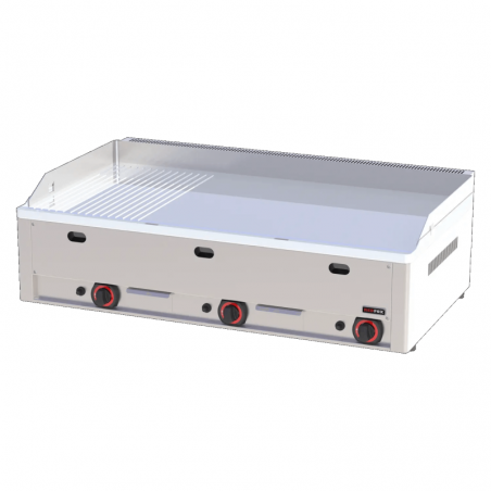 2,033.35 € TTCProfessional gas snack plate with stainless steel body, 3 separately adjustable cooking zones with smooth hard chrome coating, thickness 10mm, piezo ignition, thermostat for temperature regulation from 50°C to 300°C, dimensions of the cooking plate: 970 x 480mm, container for liquid grease, independent heating zones, adjustable feet, natural gas mounted, propane butane gas injectors supplied