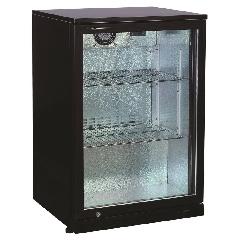 663.43 € TTCArrière-bar réfrigéré 138L à portes battantes, éclairage LED, thermostat numérique, extérieur skin plate noir, intérieur aluminium estampé, réfrigération assistée 0°C/+10°C, dégivrage automatique, fermeture à clé