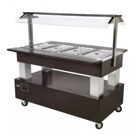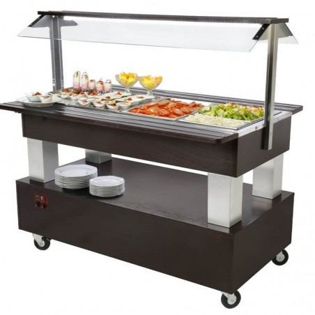 2,989.32 € TTCMobile refrigerated buffet with solid wood structure in wenge color as standard (on request in light oak or white lacquered version), cold +2 to +10°C, electronic thermostat with high precision digital display, capacity 4 GN1/1 deep 150mm containers ( not supplied), base for storing plates and cutlery, brushed stainless steel brackets with glass breath guard and LED lighting, removable shelves with aluminum profile, 4 double wheels including 2 with brakes