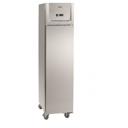 1,721.23 € TTCCompact positive refrigerated cabinet on wheels of 335L, entirely designed in stainless steel, included 3 height-adjustable slides for GN1/1 and GN1/2 containers, ventilated air refrigeration with adjustable service temperature from 0°C to 10°C in intervals of 1°C with digital display, door with key lock, right stop, interchangeable