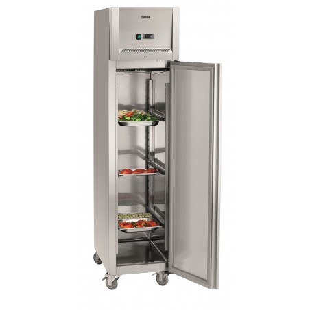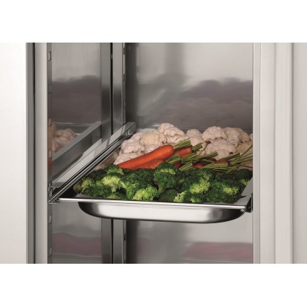 Particularly compact thanks to its height-adjustable longitudinal slides, this professional stainless steel cabinet allows you to store prepared meals directly in GN1/1 and GN1/2 containers, at an ideal serving temperature between 0°C and 10 °C, adjustable in 1°C increments.