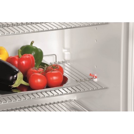 Ideal for small spaces, the Bartscher Compact refrigerator offers 122L of storage on 3 height-adjustable levels. The temperature is manually adjustable on 5 levels from 0°C to 8°C thanks to the thermostat.