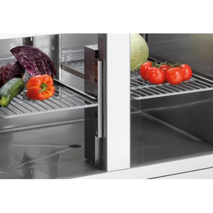 1,613.66 € TTCPreparation table for 5 GN1/6 containers with 260L refrigerated enclosure closed by 2 self-closing hinged doors, in GN1/1 format, stainless steel cutting surface, refrigeration by ventilated air adjustable from 0°C to 10°C, display digital, included 2 GN1/1 grids, stainless steel filter, stainless steel lid, delivered without GN containers