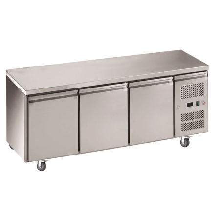Le table réfrigérée sur roulettes possède une enceinte de 465L fermée par 3 portes avec système de fermeture automatique, et réfrigérée par froid ventilé de -2°C à +8°C, réglable par thermostat électronique DIXELL. Elle sera idéale pour conserver une grande quantité de denrées alimentaires à portée de main avant de les travailler sur le dessus en inox.