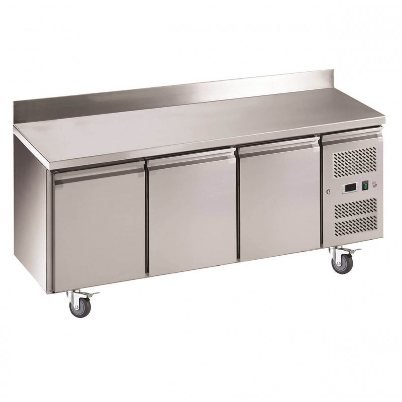 Le table réfrigérée sur roulettes possède une enceinte de 465L fermée par 3 portes avec système de fermeture automatique, et réfrigérée par froid ventilé de -2°C à +8°C, réglable par thermostat électronique DIXELL. Elle sera idéale pour conserver une grande quantité de denrées alimentaires à portée de main avant de les travailler sur le dessus en inox avec dosseret 100x20mm.