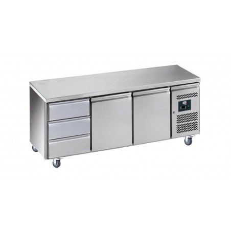 Le table réfrigérée sur roulettes possède une enceinte de 465L fermée par 2 portes avec système de fermeture automatique, ainsi que 3 tiroirs pour bacs GN1/1 de 65mm de profondeur. L'enceinte est réfrigérée par froid ventilé de -2°C à +8°C, réglable par thermostat électronique DIXELL. Elle sera idéale pour conserver une grande quantité de denrées alimentaires à portée de main avant de les travailler sur le dessus en inox.