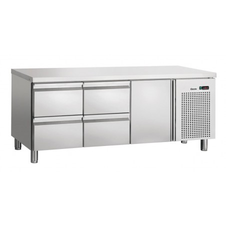 3,128.83 € TTCBartscher S4T1-150 refrigerated table entirely in stainless steel equipped with a refrigerated enclosure closed by 1 hinged door and 4 drawers in GN1/1 formats, cooling by ventilated air with electronic temperature adjustment from 0°C to 10°C in increments of 0.1°C, digital display, evaporation of condensed water, thermostat, on/off switch, height-adjustable feet, optional 50mm backsplash, included 1 GN1/1 grid